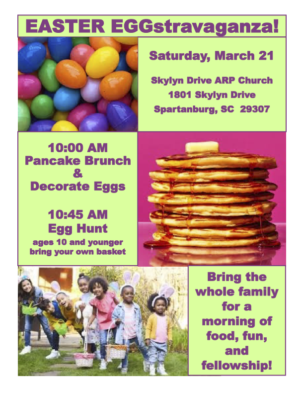 The egg hunt is open to ALL children 12 and under, so please invite your grandkids, friends, and neighbors! A separate egg hunt area will be provided for children 3 years and younger. The event begins with a pancake brunch and egg decorating craft from 10:00 to 10:45. There will be an egg hunt that starts at 10:45.